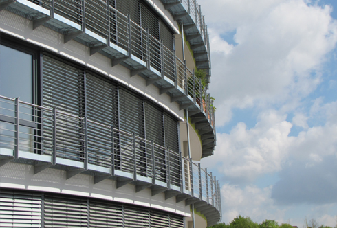 Glas und Stahl – so zeigt sich die viergeschossige sanft geschwungene Fassade zum Stadtpark, der Stadtpark wird zur inneren Fassade, die Fassade zum Spiegel der Parklandschaft. Filigran umlaufende Stege aus Gitterrosten erweitern die Balkonflächen und helfen nebenbei beim Reinigen der Glasfassade.